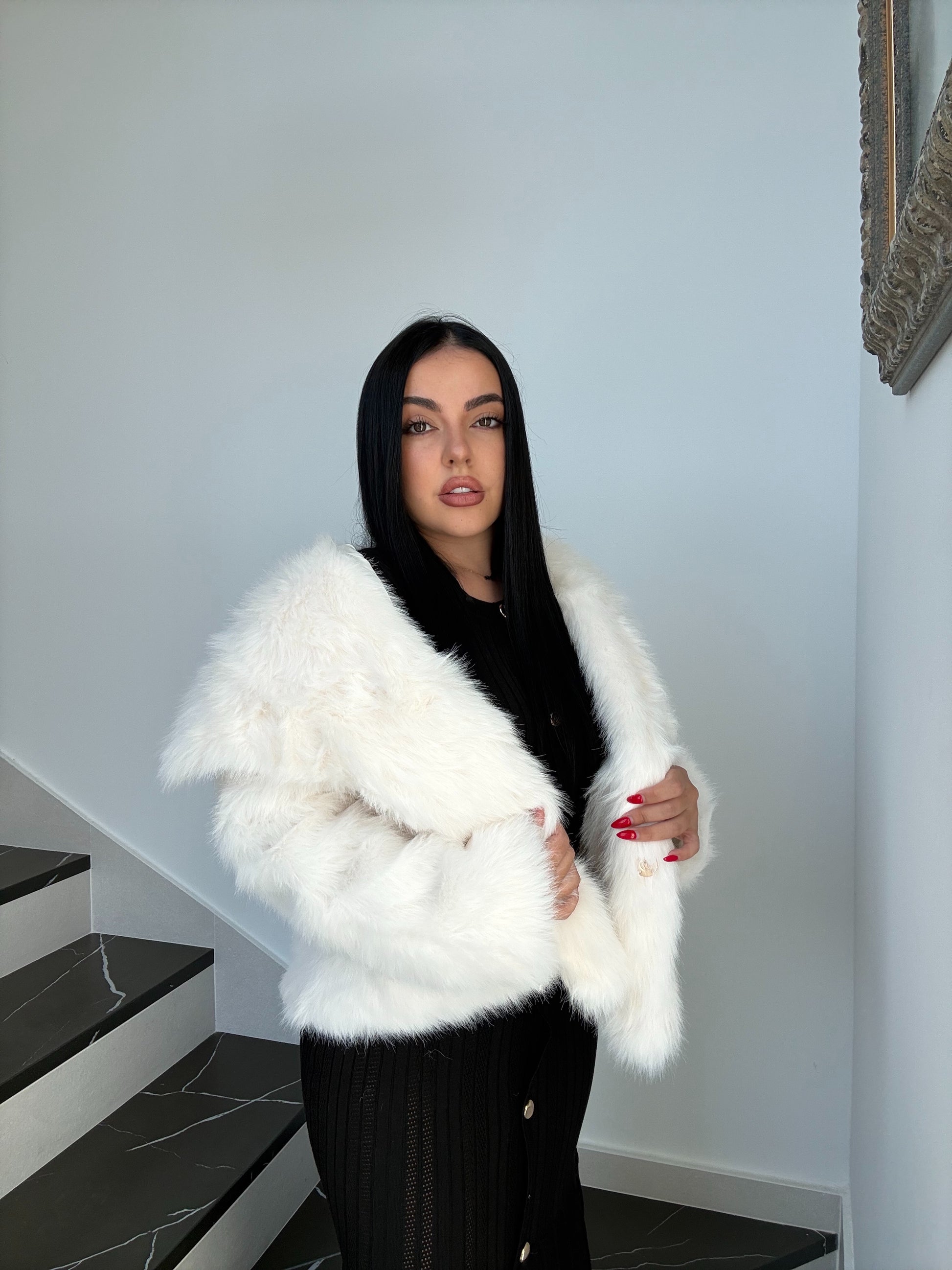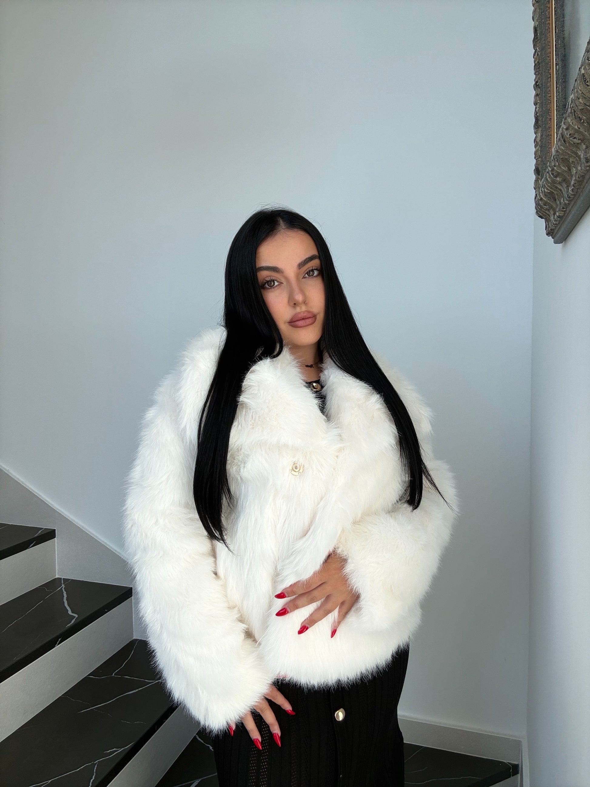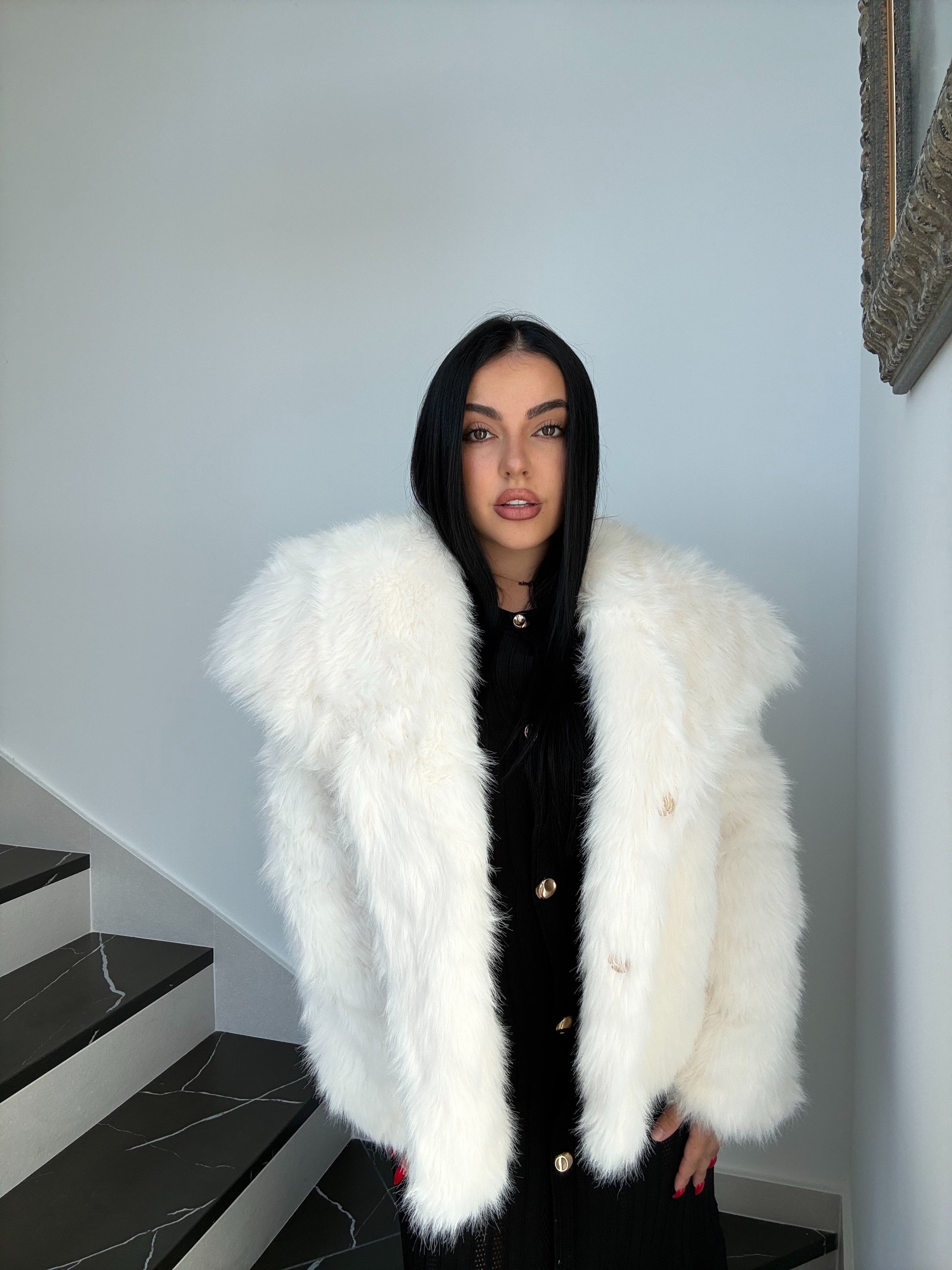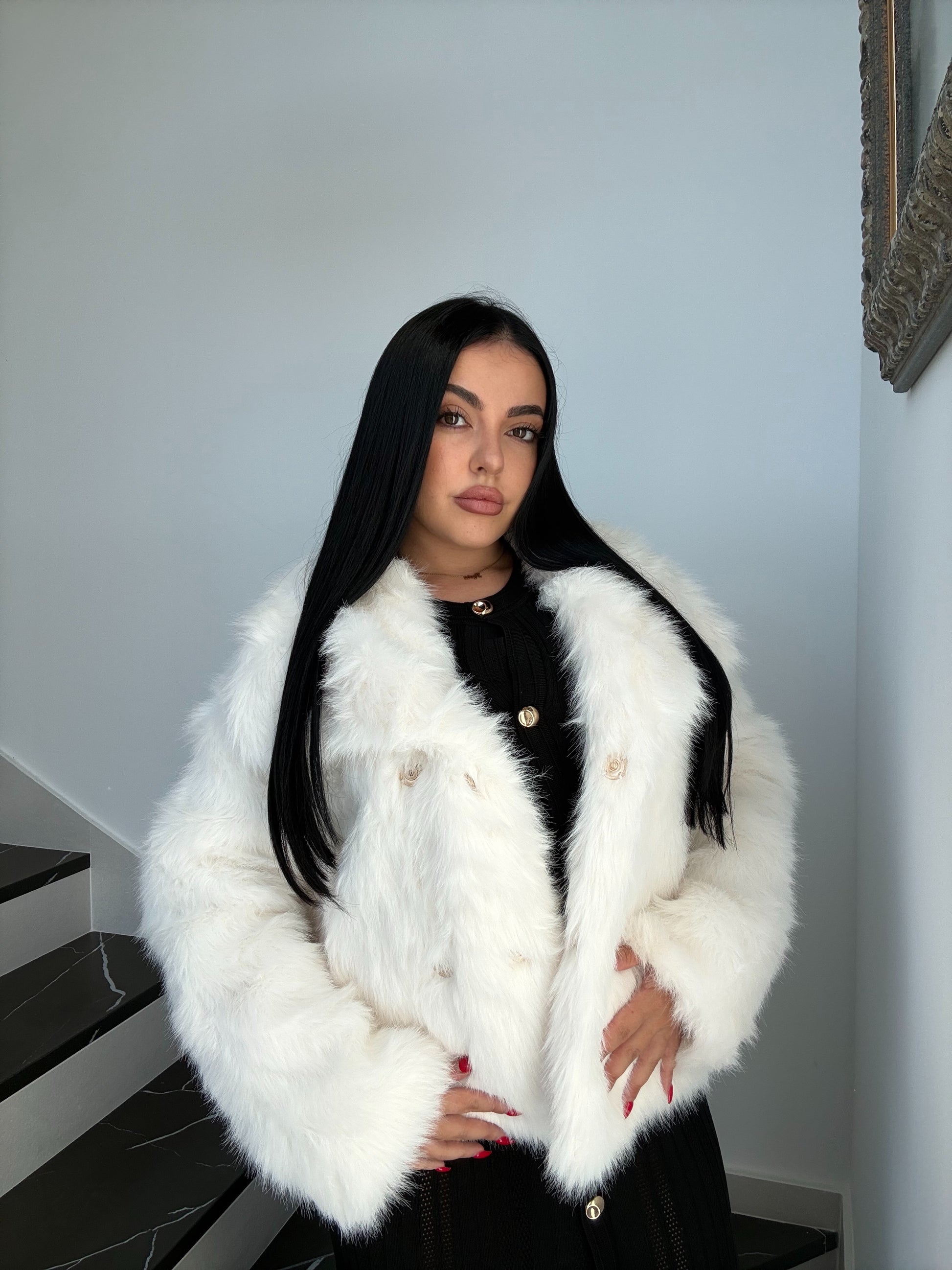 Abriga con estilo este invierno con nuestro abrigo de pelo sintético blanco. Suave, calentito y con un diseño moderno que combina con todas las prendas de la Web.Los botones dorados le dan un toque especial sin perder la sencillez.