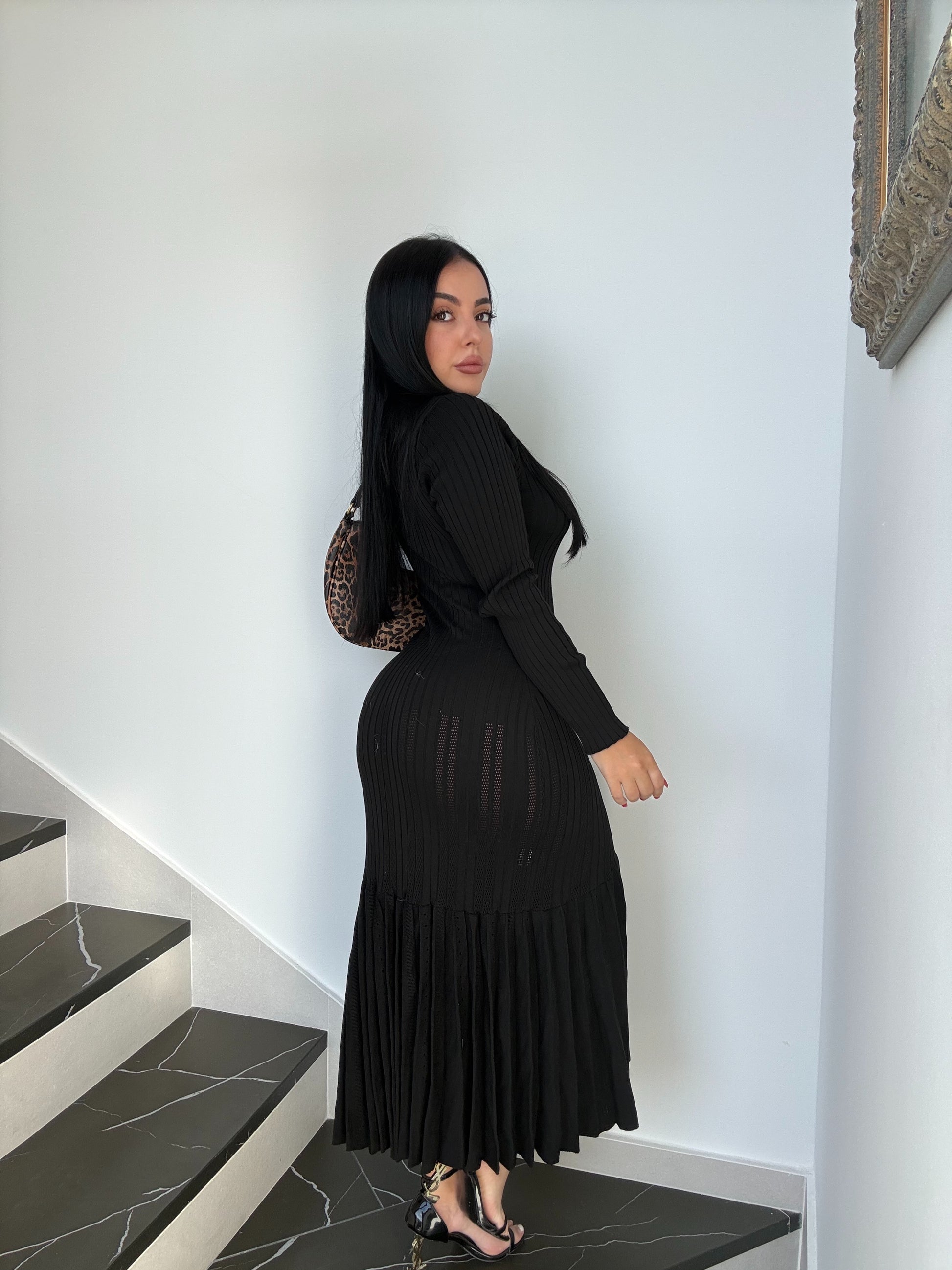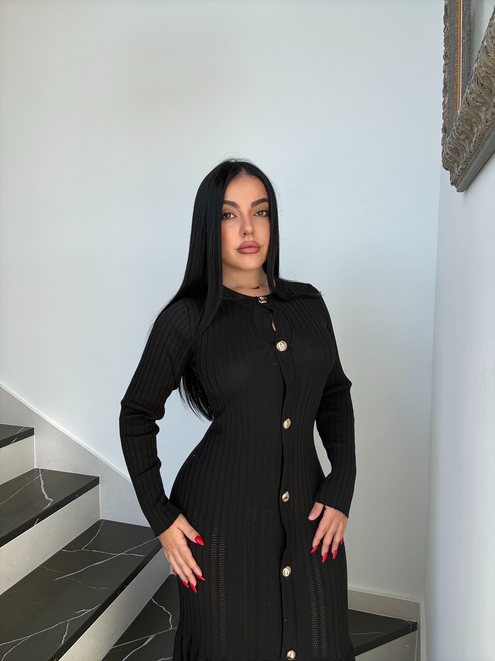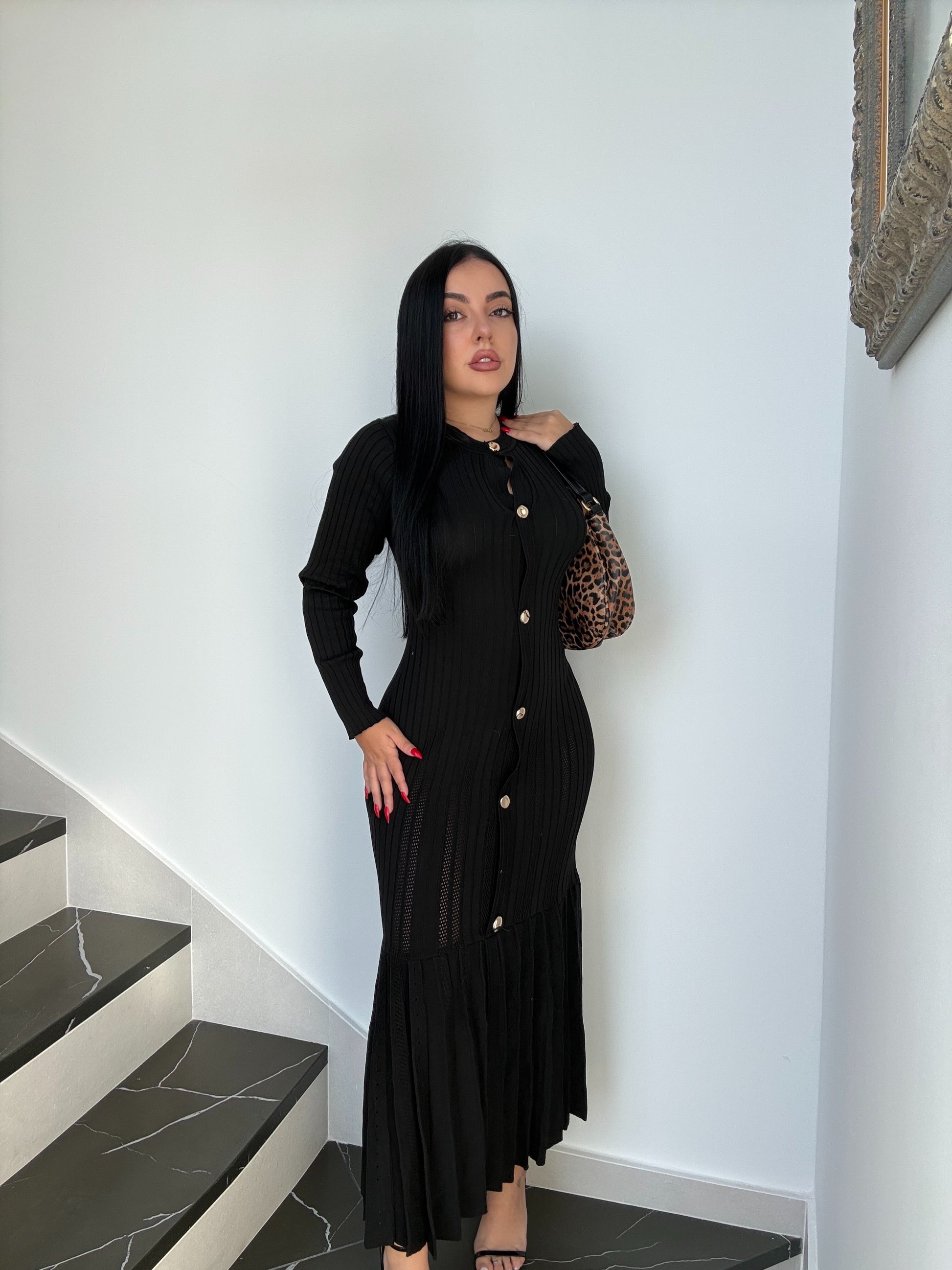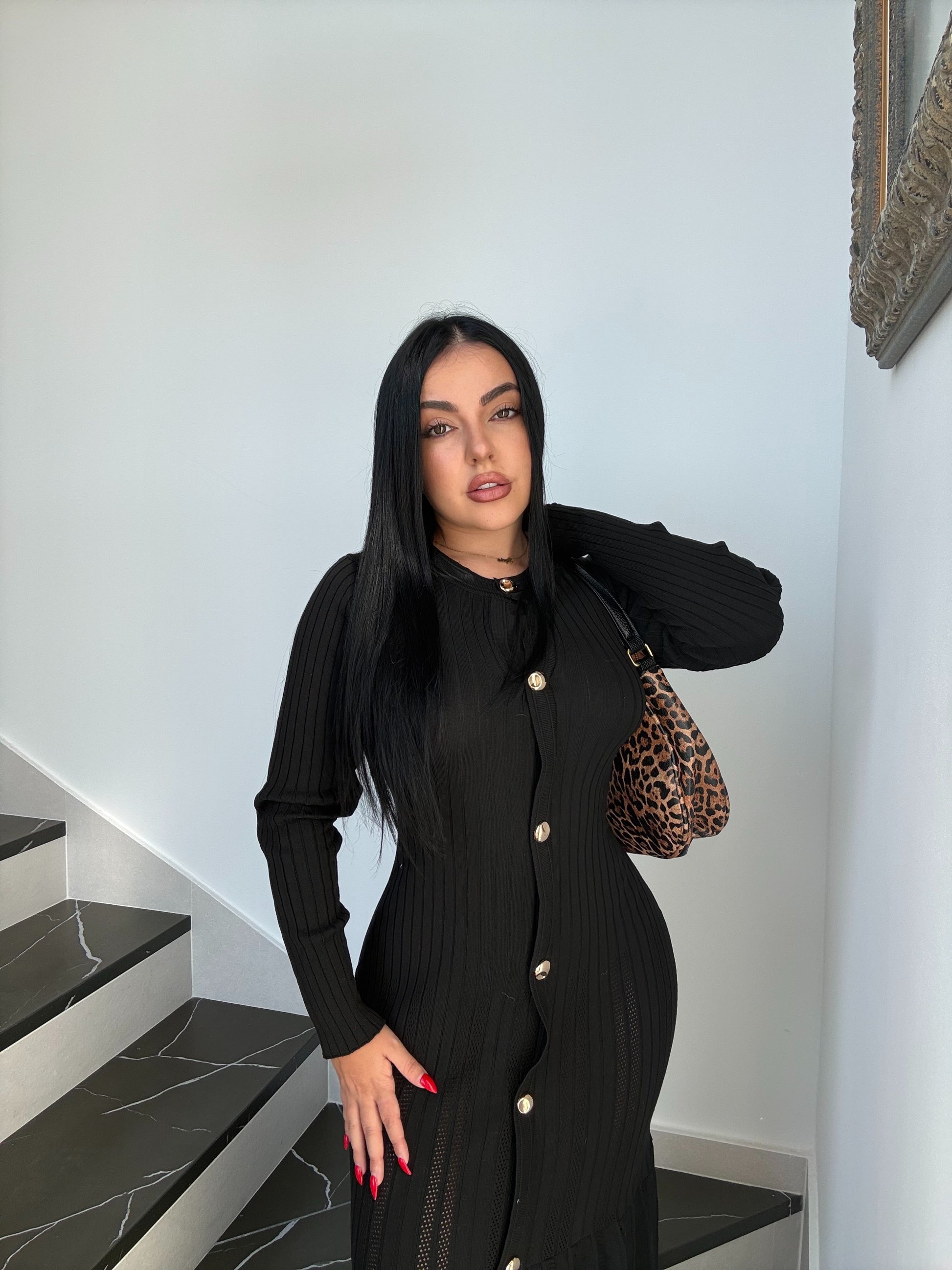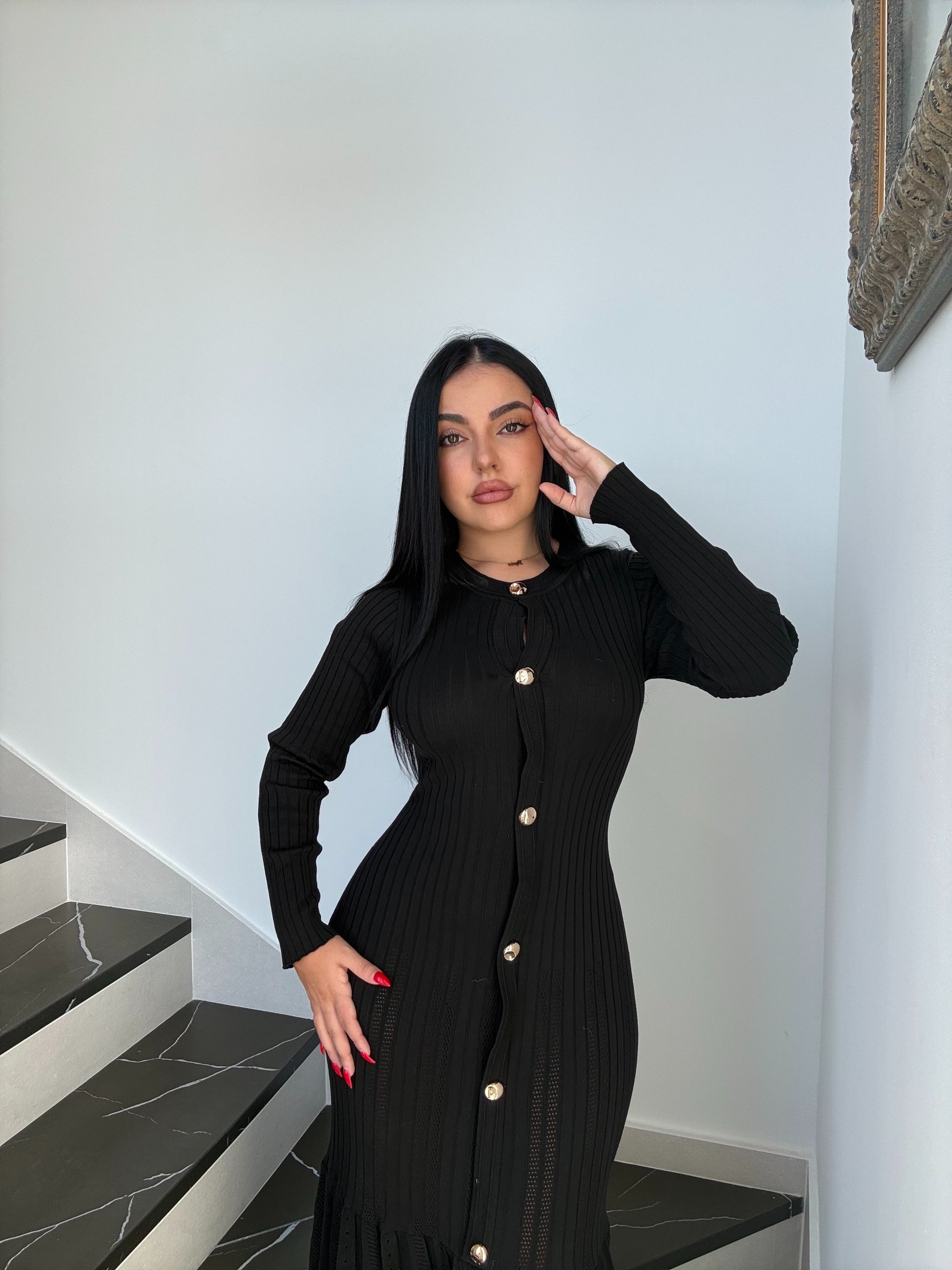 Este vestido largo de punto canalé en color negro combina sofisticación y sensualidad en un solo diseño. Su silueta entallada realza la figura, mientras que los botones dorados frontales añaden un detalle clásico y chic.