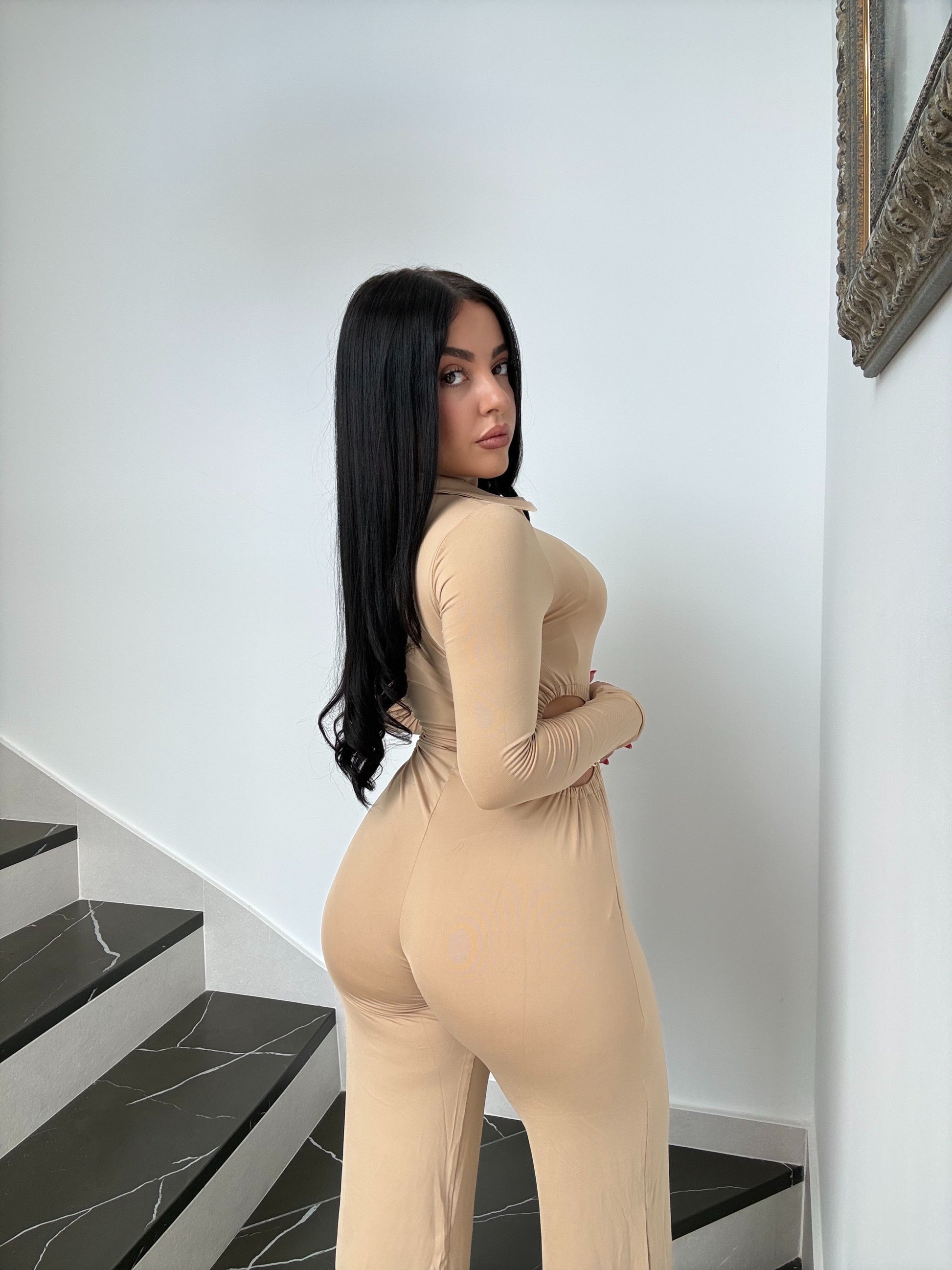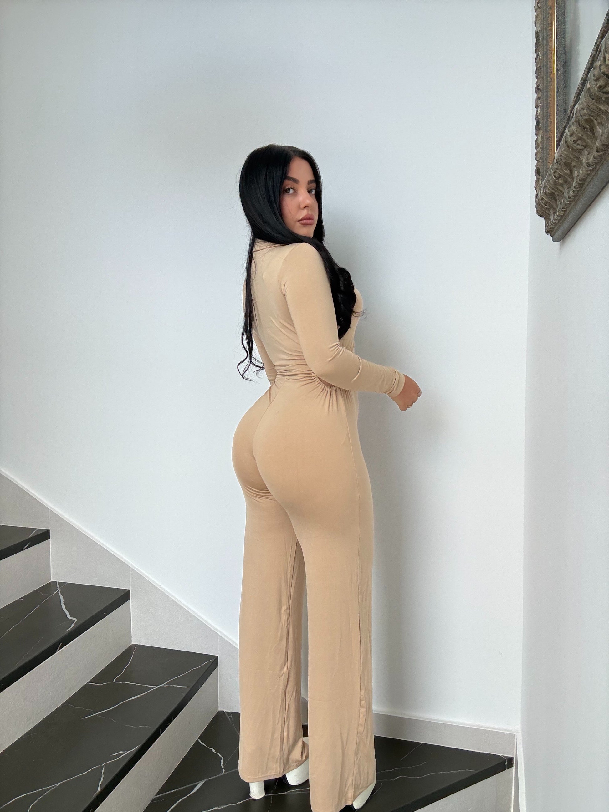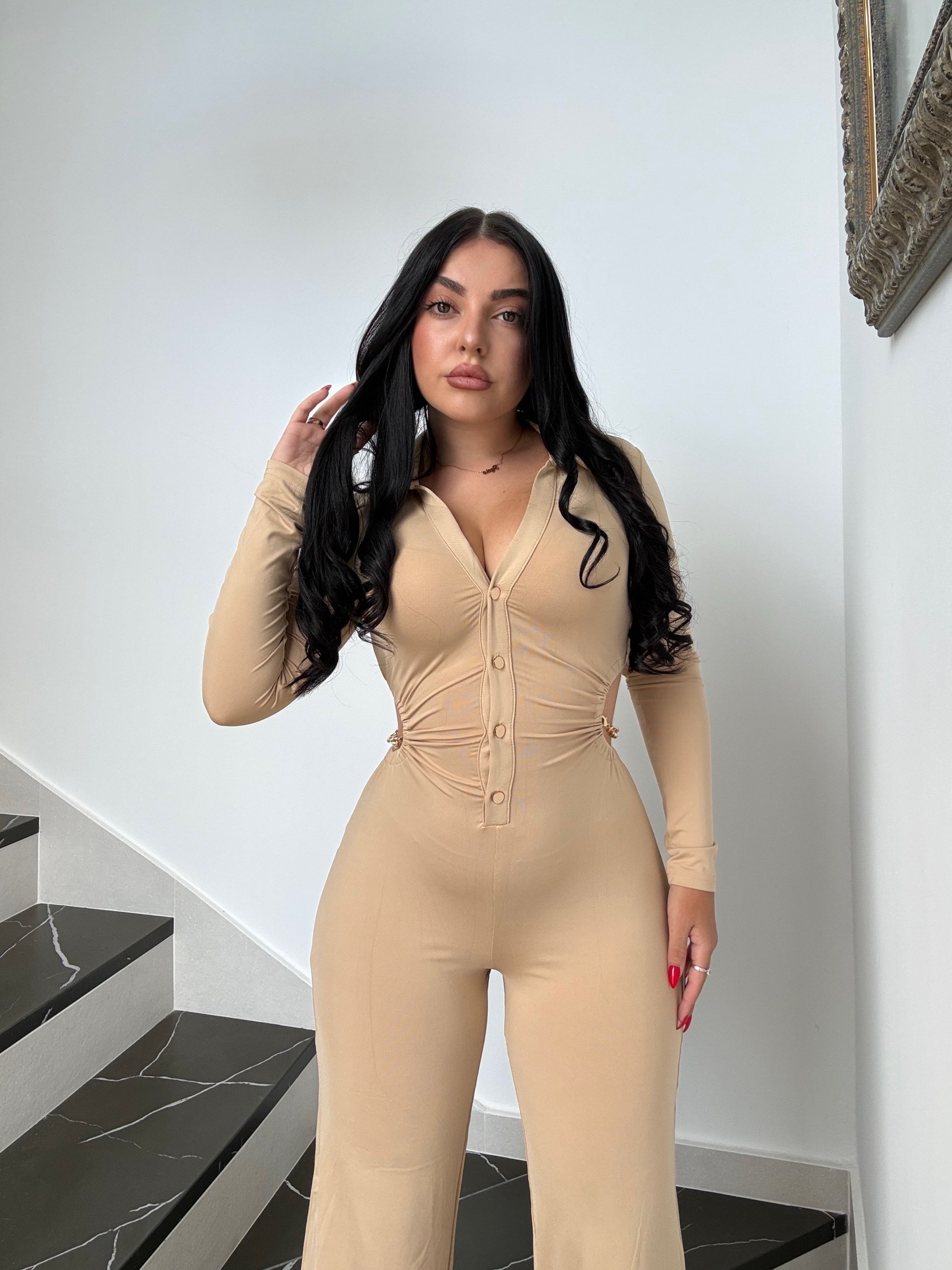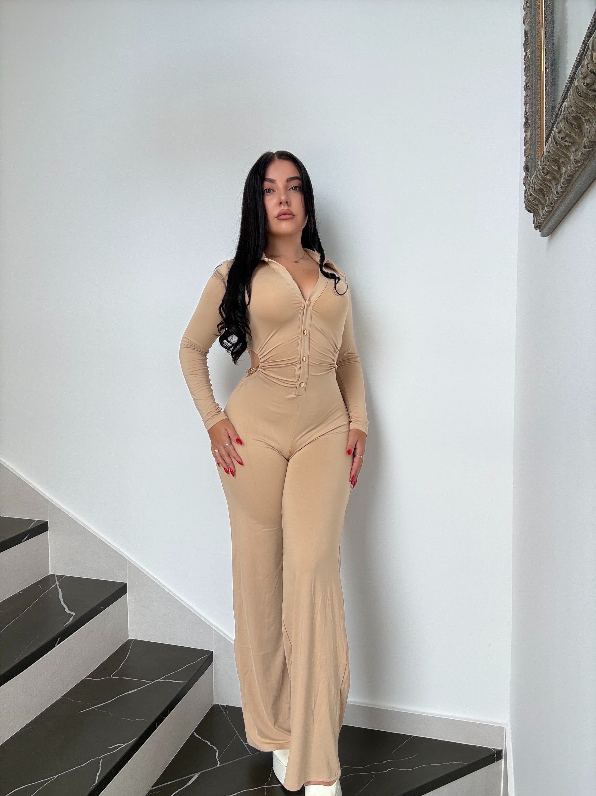 También dispone de un escote pronunciado, con botones dorados para adaptarse a tu pecho, dando la silueta perfecta, y, como no, el estilo que todas buscamos en un mono, el acabado en campana.