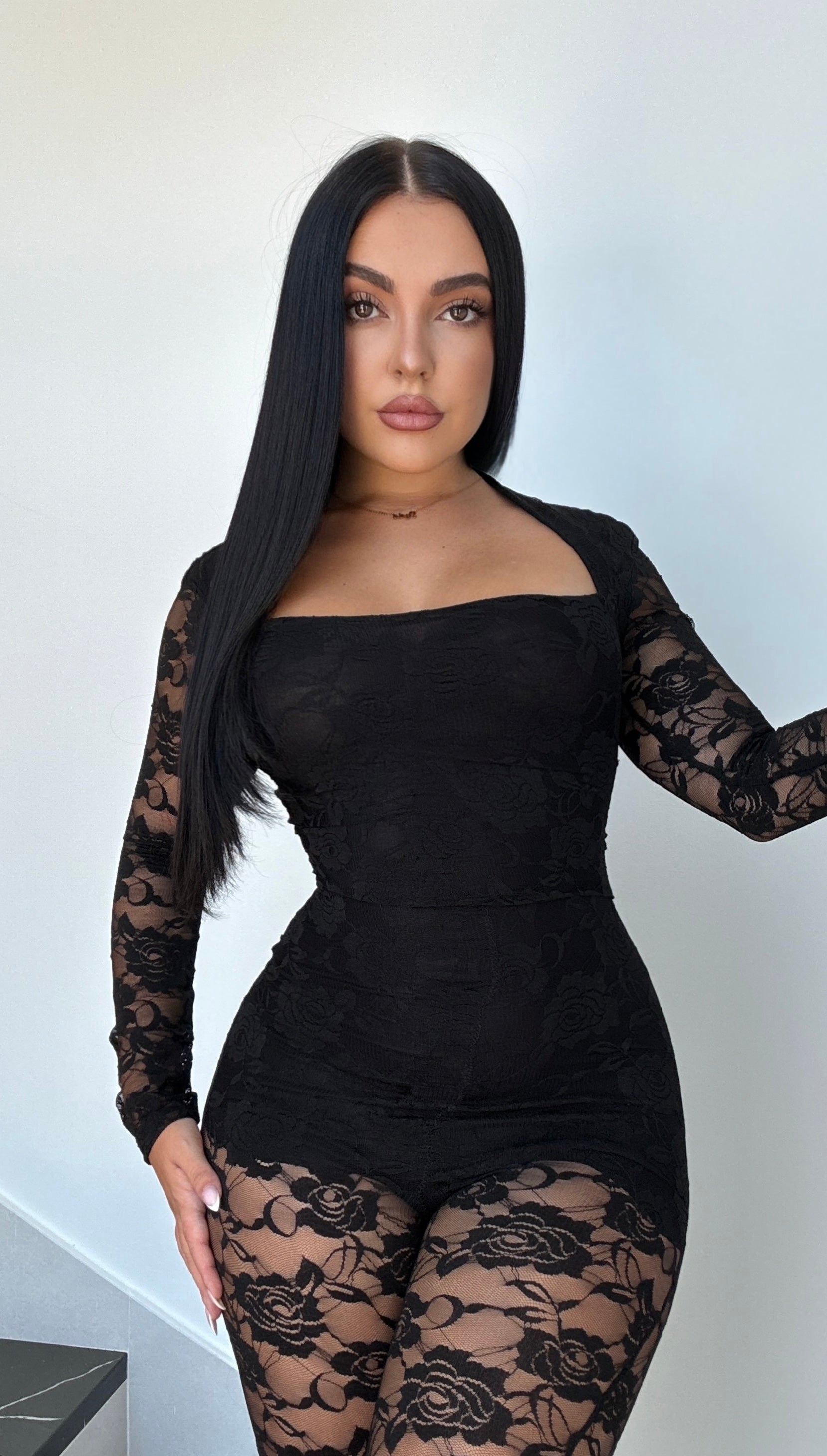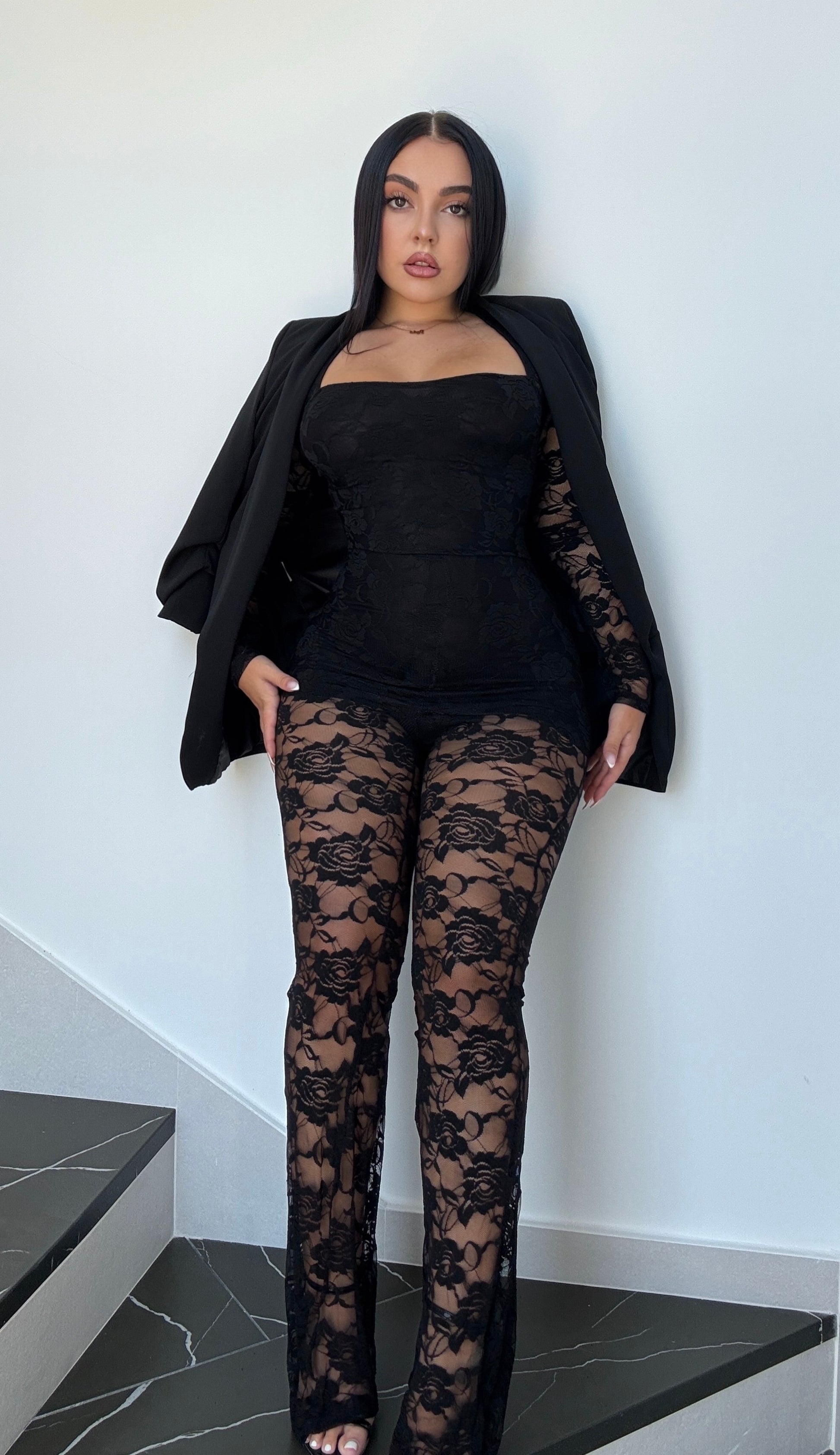 A partir de la cintura, el conjunto se transforma con una capa de encaje transparente de flores negras, que se extiende en forma de pantalón largo hasta los pies, creando un efecto de segunda piel irresistible. El encaje floral deja entrever la piel de manera sutil y sexy, logrando un look impactante y femenino.