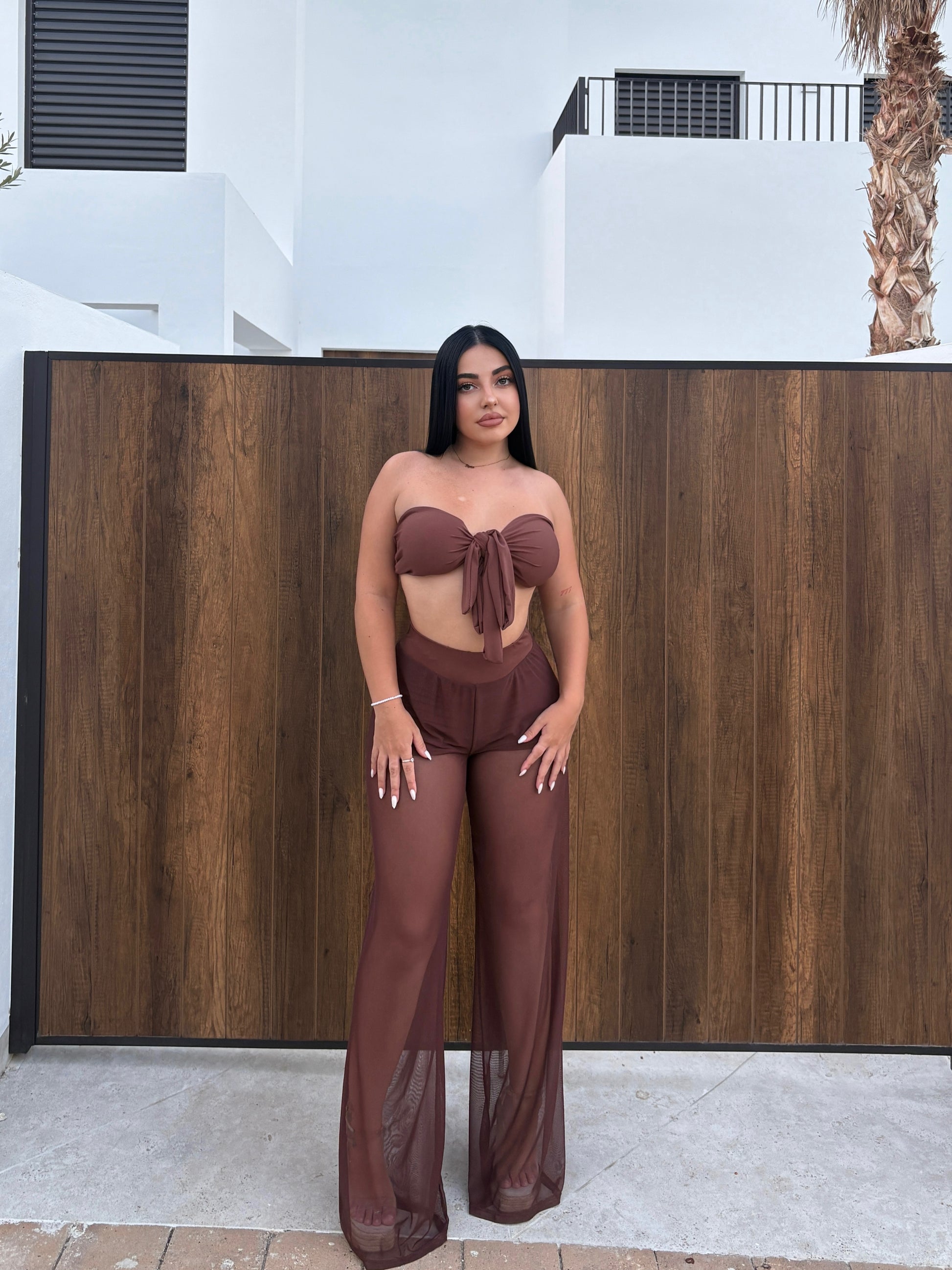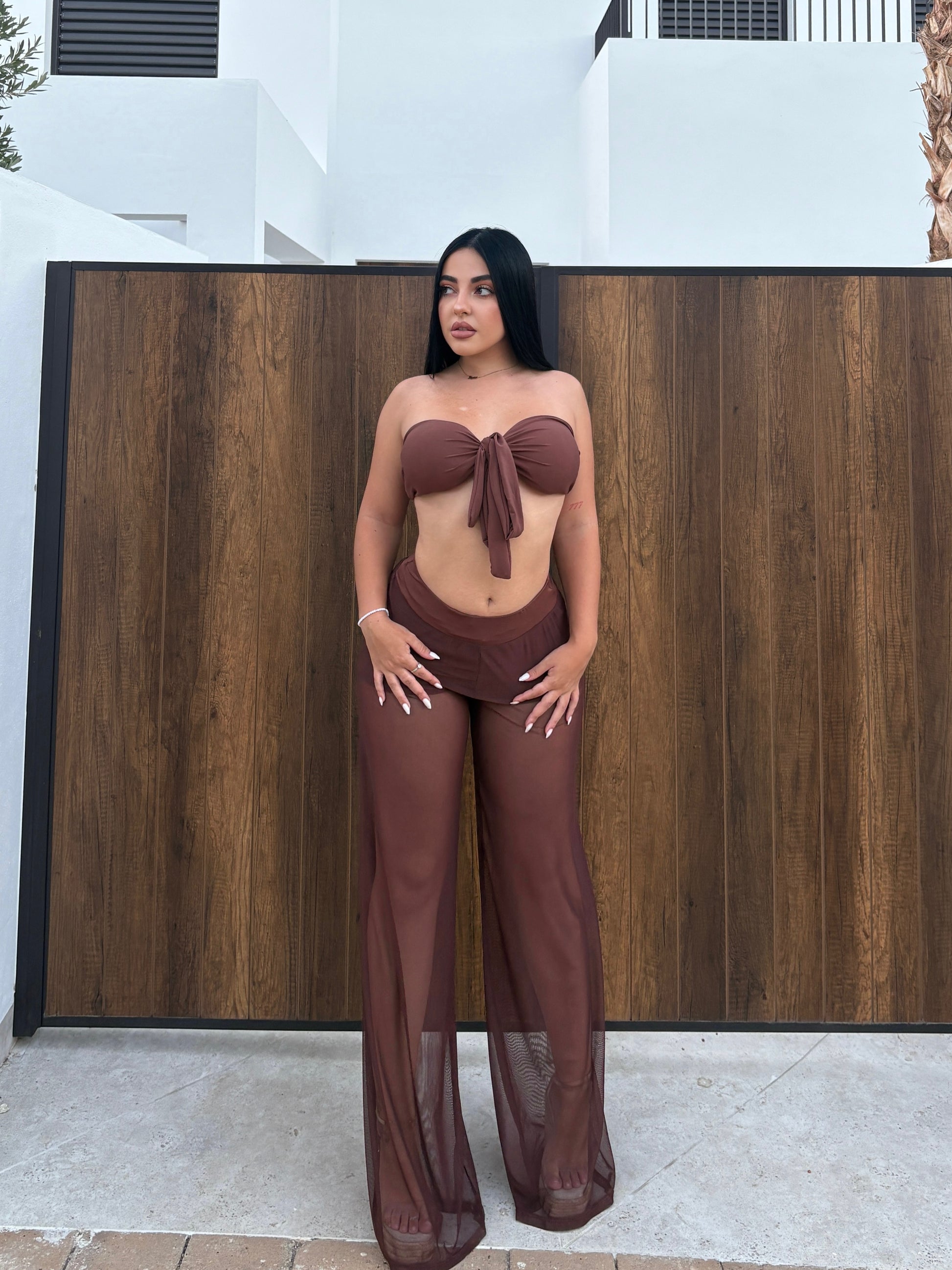Eleva tu look de verano con nuestro exclusivo conjunto Sahara Sunset. Este set de dos piezas en tono chocolate está diseñado para destacar tu figura con estilo y elegancia. El top tipo bandeau con lazo frontal es ajustable, aportando un toque coqueto y moderno, mientras que el pantalón palazzo de malla translúcida añade sensualidad y frescura perfecta para climas cálidos.