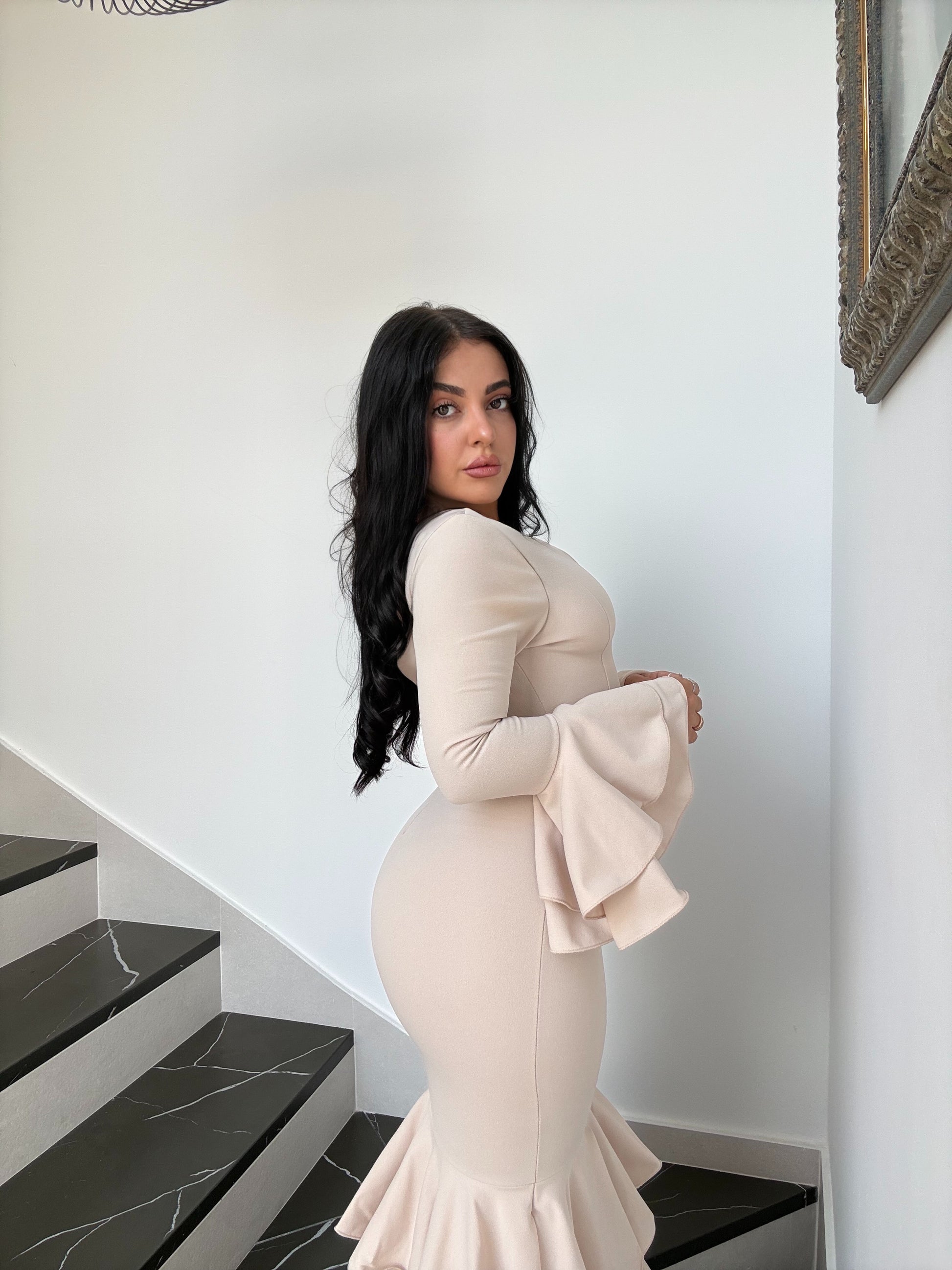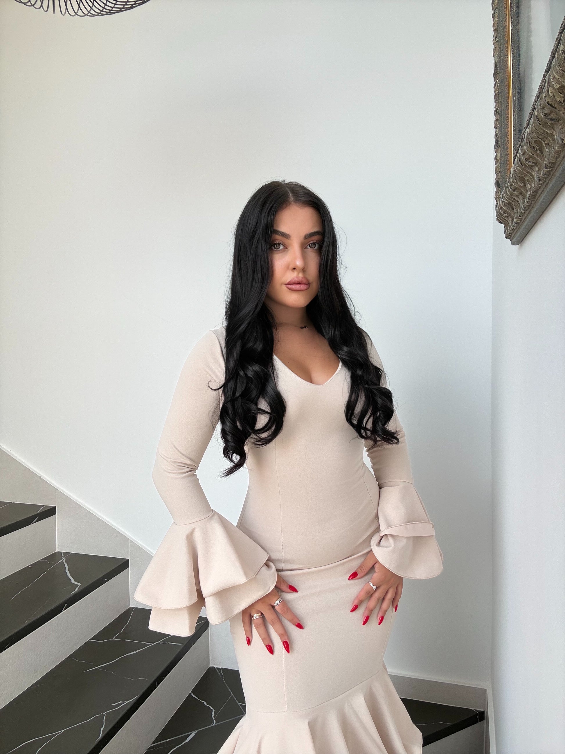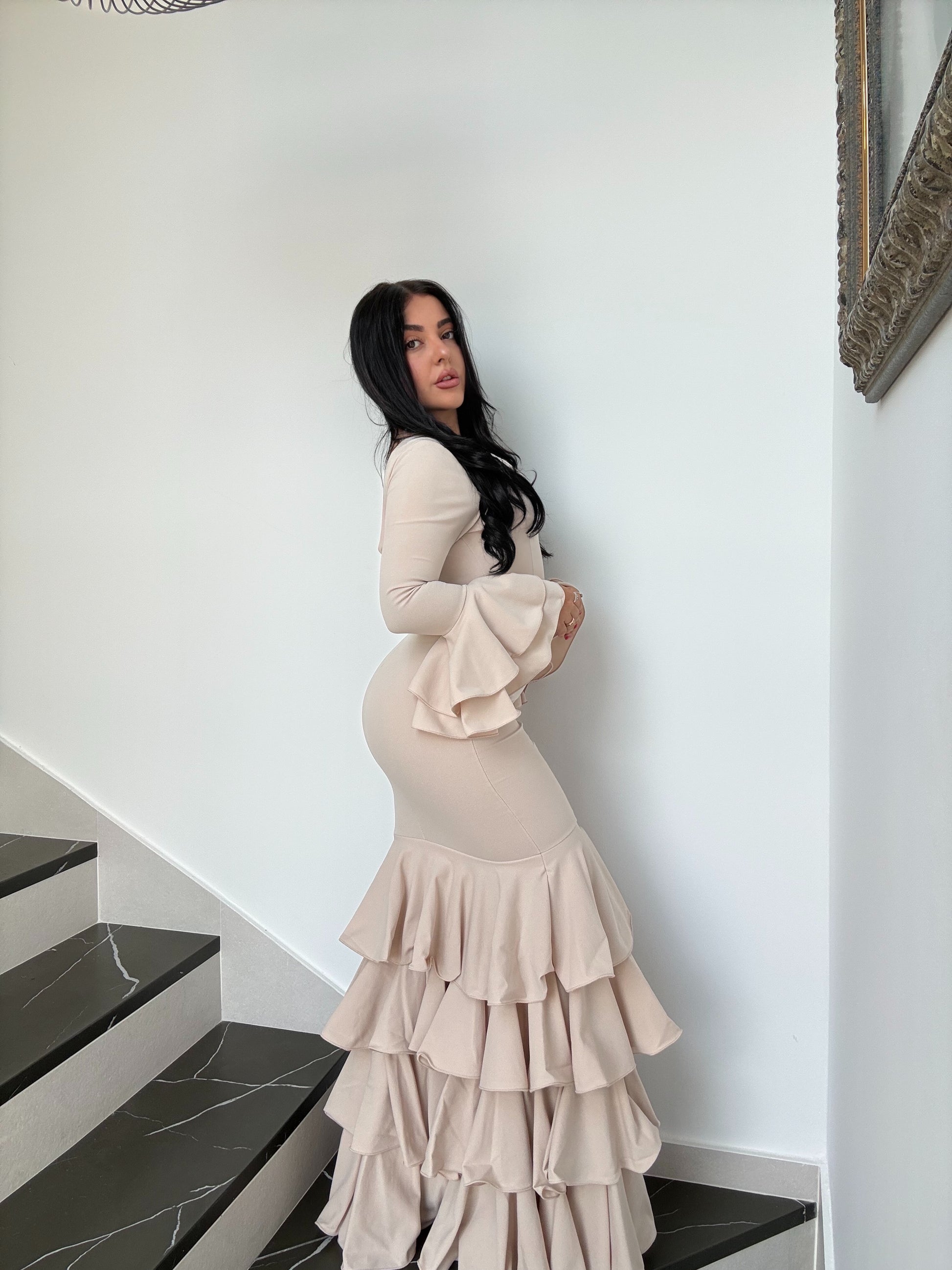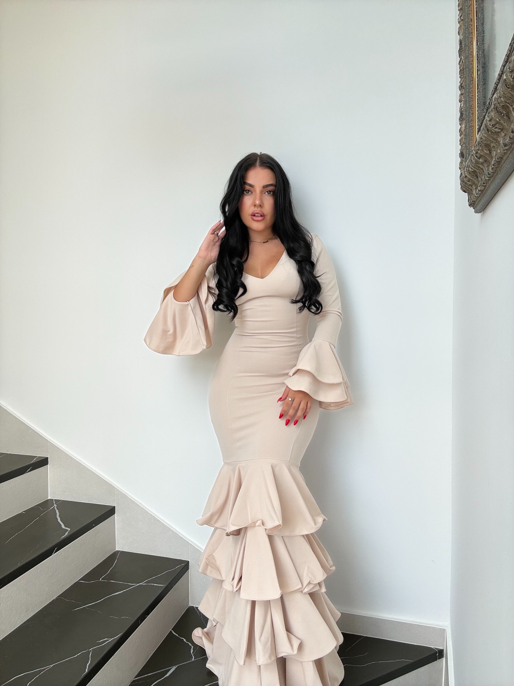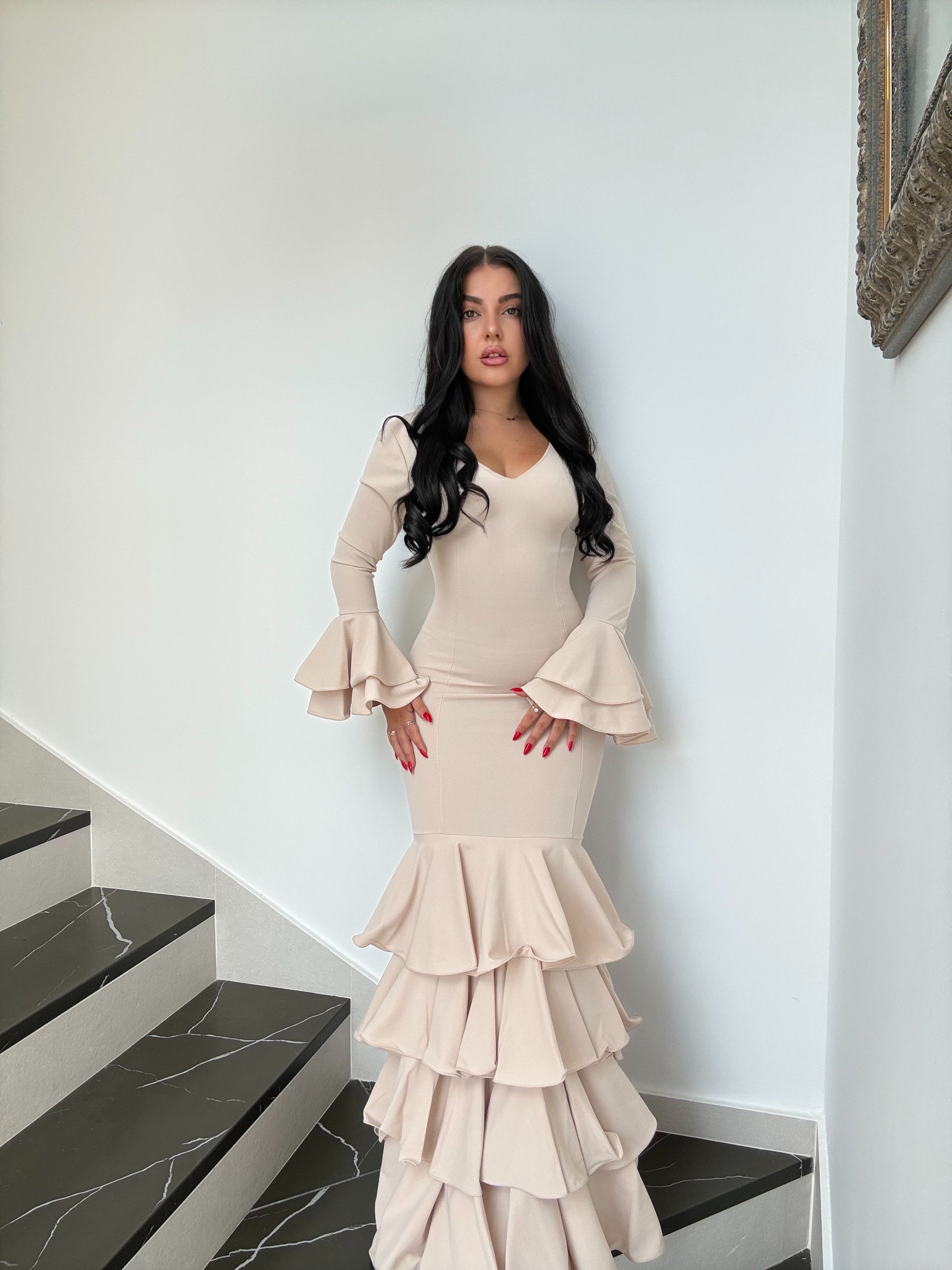 Luce mangas largas con volantes amplios que dan porte y una falda de volantes en cascada que aporta movimiento y elegancia en cada paso.