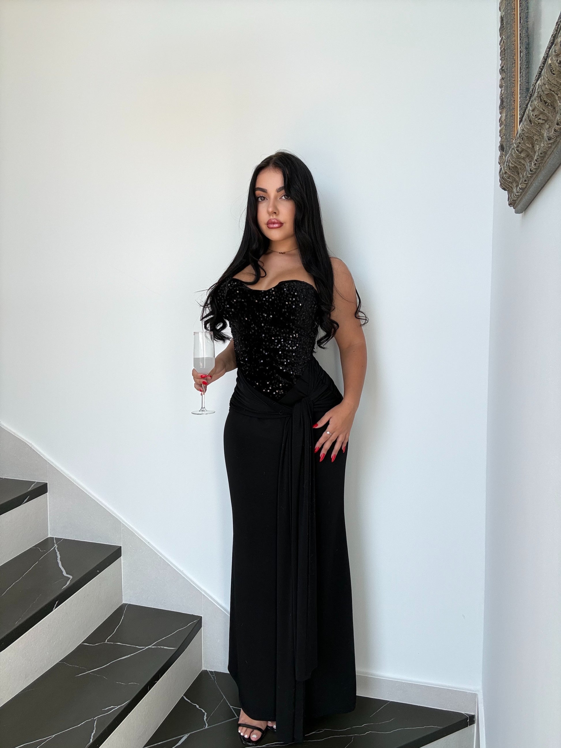 Celebra las fiestas con el encanto único de este vestido, creado para brillar en las noches más especiales. Su corset de lentejuelas en negro ilumina con un destello vibrante, mientras que la falda larga con detalle de lazo en la cintura aporta movimiento y un acabado impecable.
